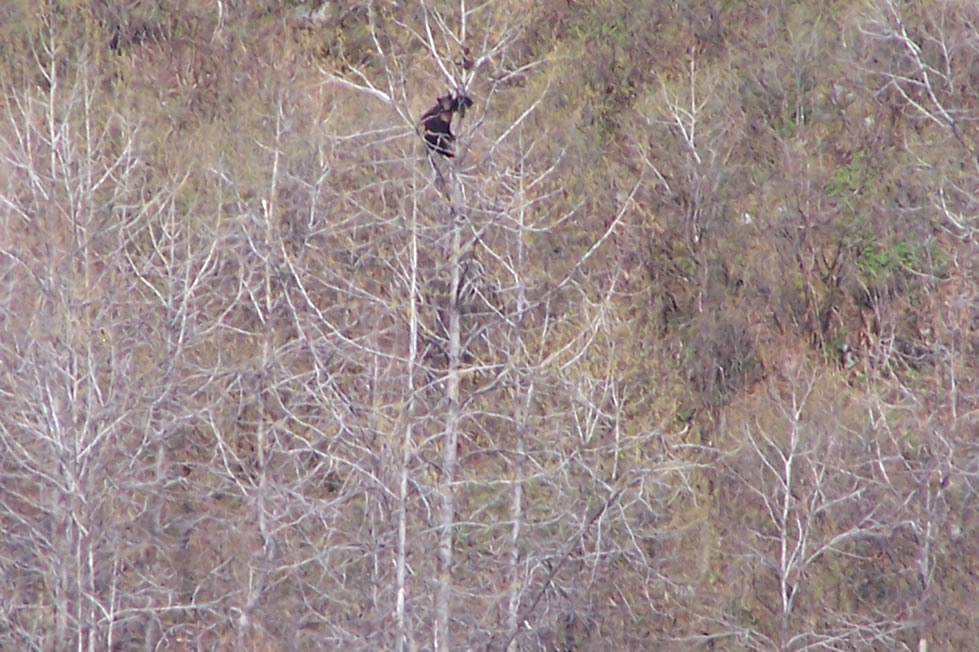 Mama bear and 2 cubs scared up a tree by a goat.